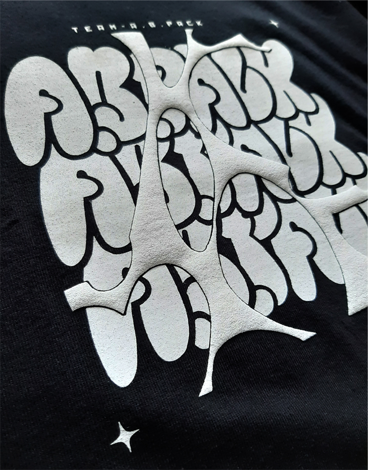 シルクスクリーンプリントに発砲プリントを組み合わせたデザインです。