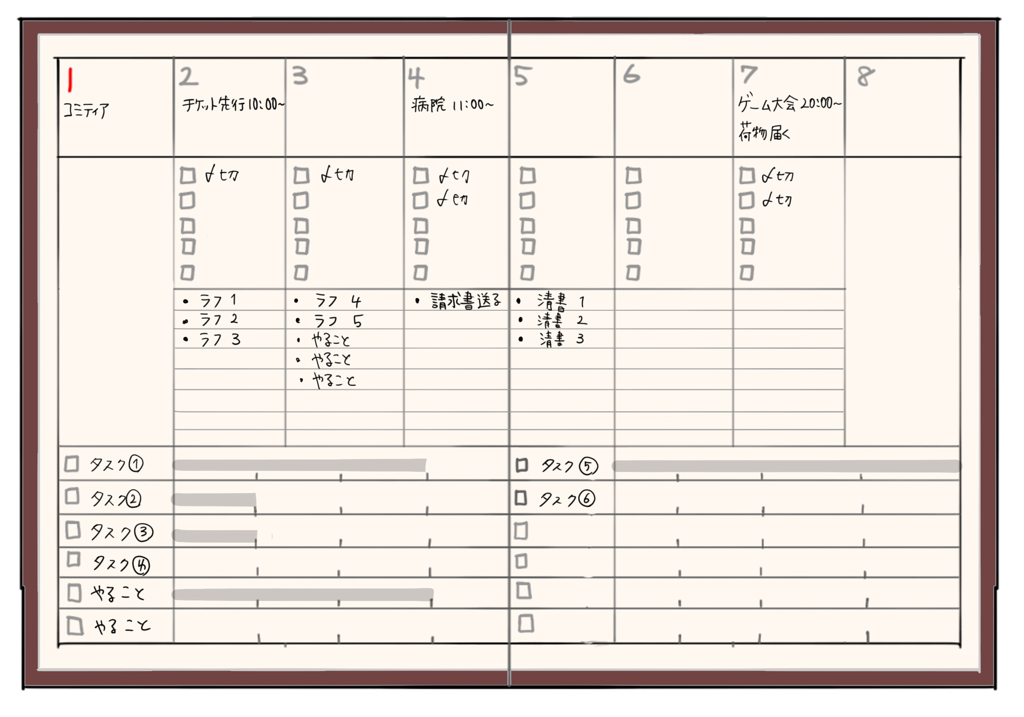 1週間の予定、今日やること、進捗状況などを見開きで見たい。